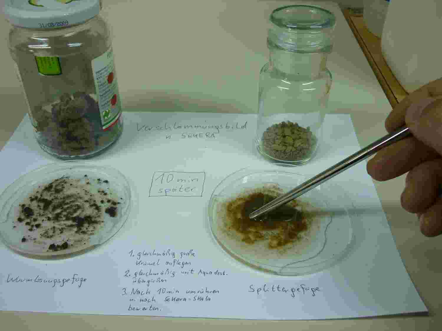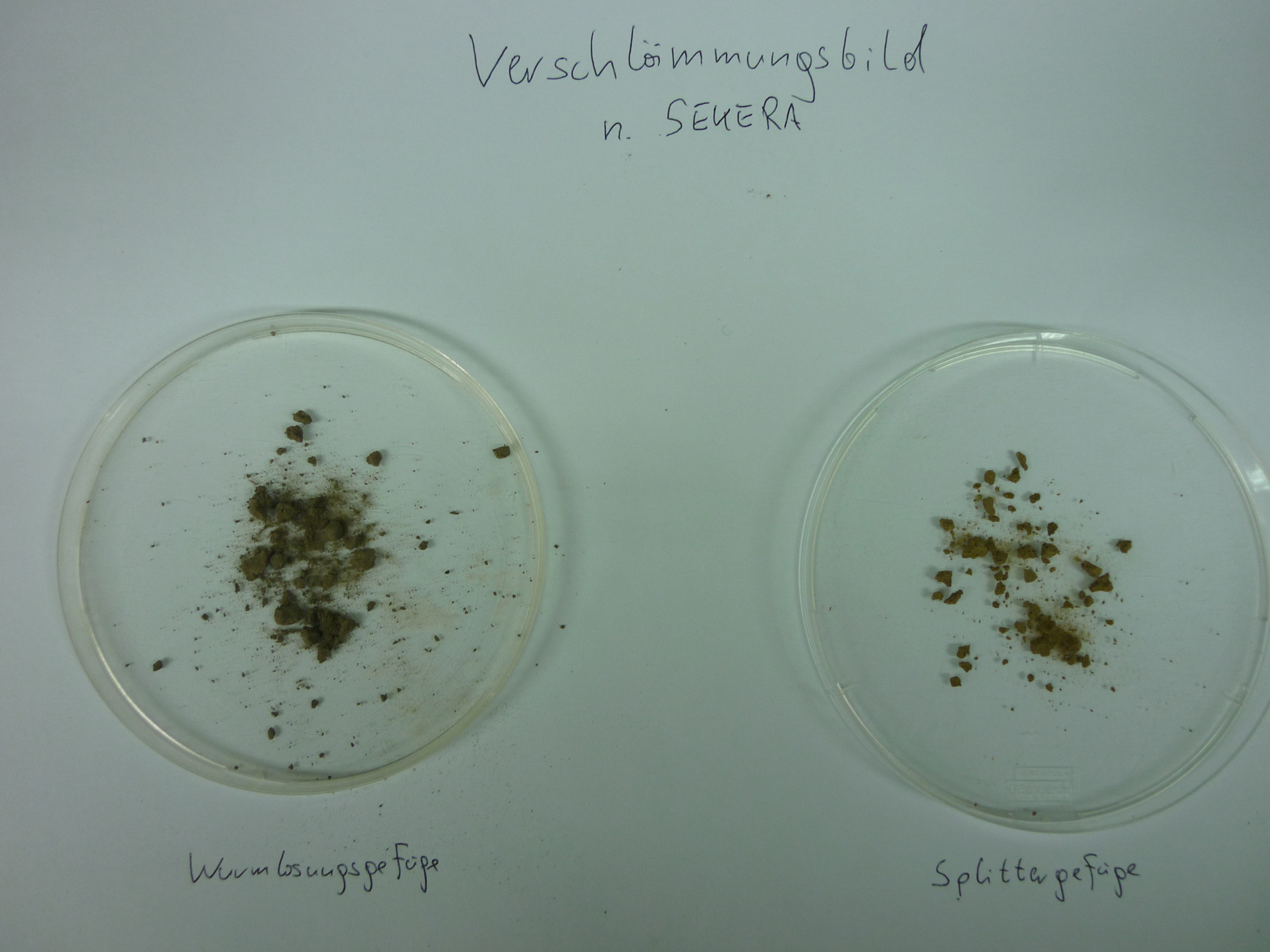 Vergleich der Aggregatstabilität mit dem Verschlämmungsbild nach SEKERA. Durch Ansetzen der Aggregate in dest. Wasser lässt sich nach 10 min und anschließendem Umrühren die Stabilität der Aggregate feststellen. SEKERA hat dazu eine 6 stufige Beurteilungsskala erstellt.