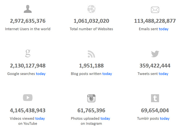 Unter der Website www.internetlivestats.com kann man eine große Bandbreite von Informationen rund um das Thema Internet abrufen. Das geht von aktiven Internet-Usern über die heute bereits verkauften Tablets, den weltweiten Internettraffic bis hin zu Strommenge und CO2-Ausstoß, die auf das Internet zurückzuführen sind. Die täglichen Daten beziehen sich dabei immer auf Uhrzeit und das Datum, die auf dem eigenen Rechner eingestellt sind.