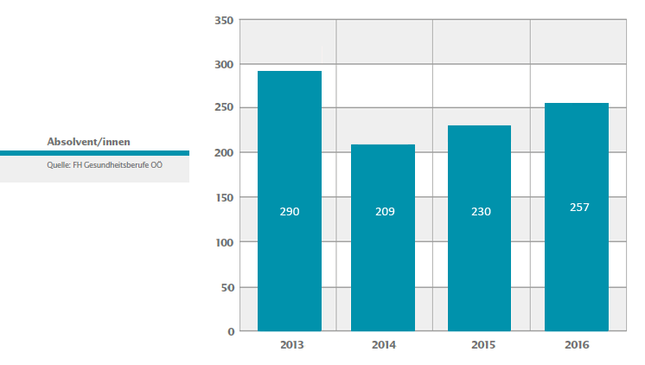 Zwischen 2013 und 2016 schlossen 986 Personen ihre Ausbildung an der FH Gesundheitsberufe OÖ erfolgreich ab – fast ausschließlich in der Mindeststudiendauer. Die unterschiedliche Anzahl der Absolvent/innen ist darauf zurückzuführen, dass nicht in jedem Jahr alle Studiengänge gestartet werden.