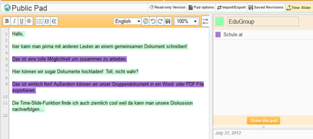 - Funktionen „Saved Revisions“, „Show History“ oder „Time Slider“: ermöglichen die History des pads zu begutachten und bereits gelöschte Inhalte wieder aufzurufen. Mit dem Time Slider ist es möglich, durch Verschieben des Reglers die komplette Entsehung des Dokuments zurückzuverfolgen.