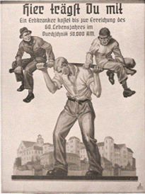 Die Abbildung wird mit den Worten kommentiert:„Hier trägst Du mit! Ein Erbkranker kostet bis Erreichung des 60. Lebensjahres im Durchschnitt 50.000 RM.“