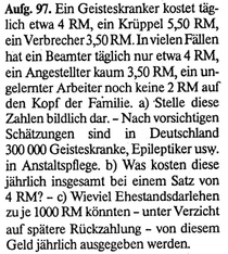 Um die öffentliche Meinung auf Parteilinie zu bringen und von der „Reinigung des Volkskörpers“ zu überzeugen, wurden auch Schulbücher für propagandistische Zwecke benutzt.