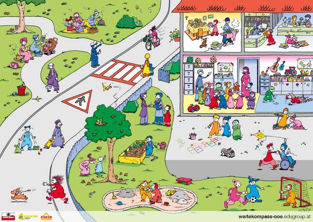 Um bei der konkreten Umsetzung Unterstützung zu leisten, wurden für verschiedene Altersgruppen Unterrichtsmaterialien entwickelt. Für die Arbeit in elementaren Bildungseinrichtungen wurde ein Wimmelbild gestaltet, das zum offenen Erzählen und zur Auseinandersetzung mit Werten einlädt.