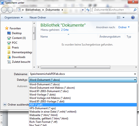 Wenn Sie Office 2007 oder 2010 besitzen, können Sie ganz einfach unter „Speichern unter“ bei Dateityp „PDF“ auswählen. Auch bei Open Office gibt es dazu einen entsprechenden Befehl im Menü.